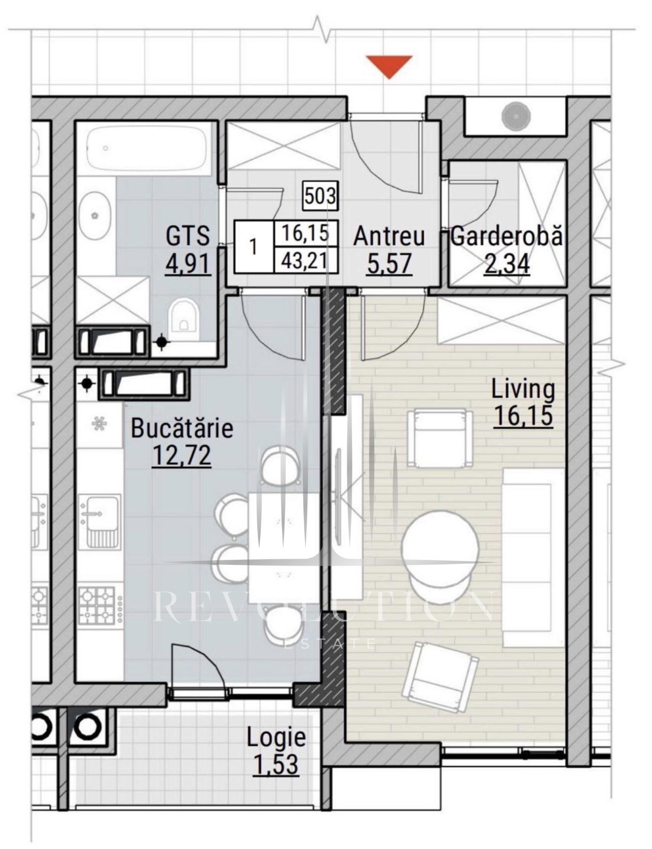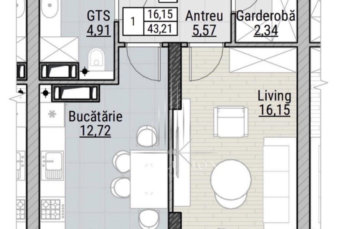 • Compartimentare: O cameră și living